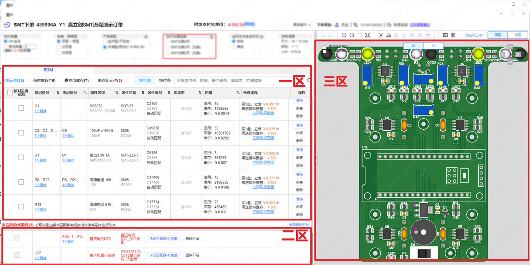 3. 三区是预览2D ,3D模式,选上的器件都会在2D 3D图显示,方便客户更直观的查看。