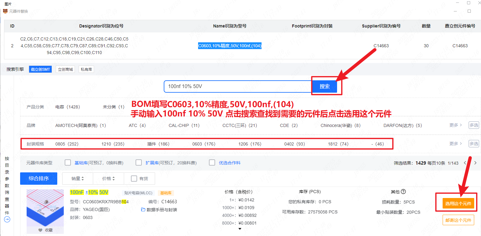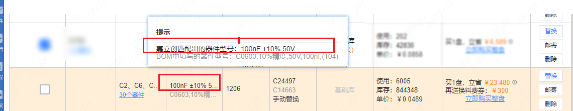 一区:所有匹配成功的器件,需要客户对匹配好的型号进行检查、确认后才可以下单,黑色字体是嘉立创最终要贴的;