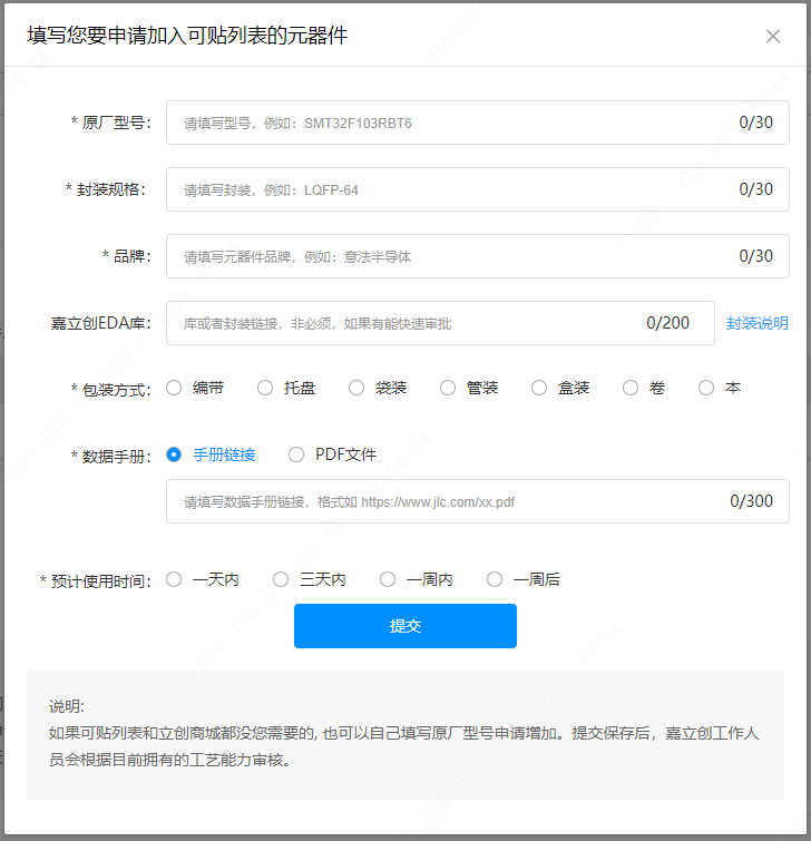2.如图所示,填写好器件的原厂型号、封装规格、品牌、包装方式以及封装数据资料(做封装库需要)后,选择预计使用时间后,即可点击【提交】申请。
