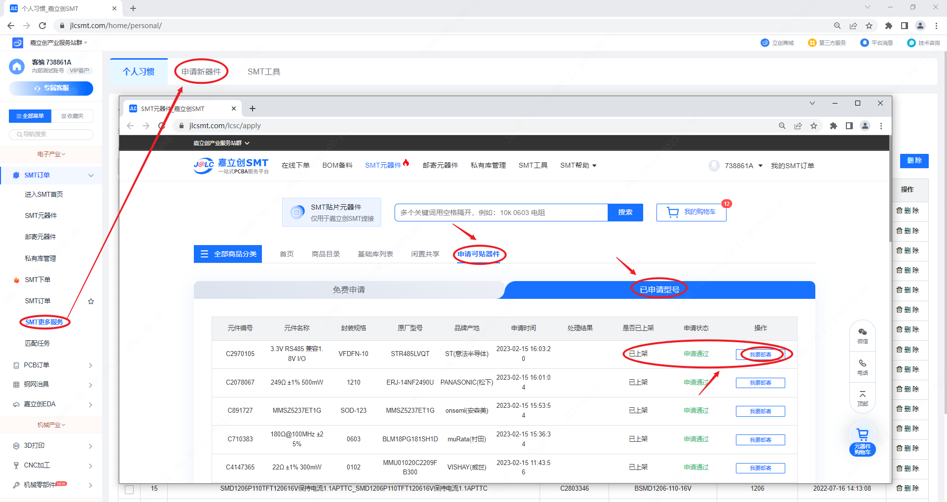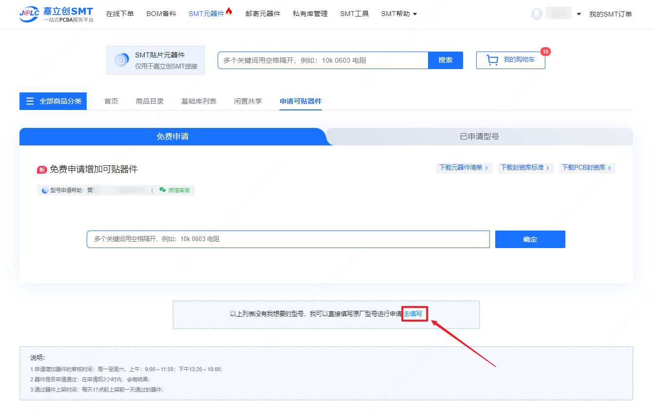 点击【SMT更多服务】---【申请新器件】---进入下个新网页,找到【申请可贴器件】按钮,在下方输入框内输入需要的器件型号点【确定】按钮。点【申请加入可贴列表】。
