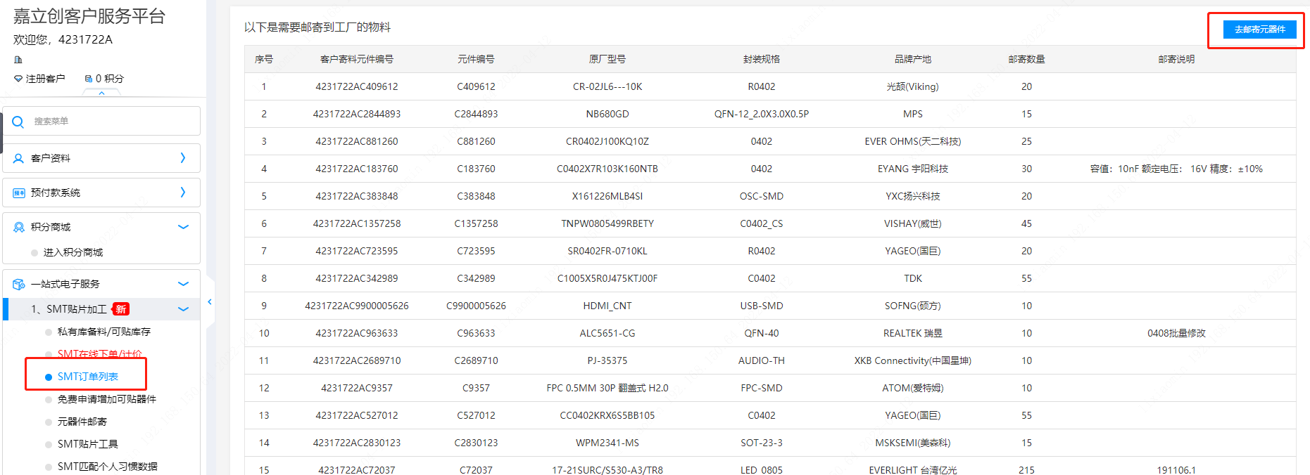 第八步:如图所示在贴片加工菜单下点开【SMT订单列表】菜单,在屏幕上方可以看需要邮寄的器件清单,点【去邮寄元器件】的按钮即可。