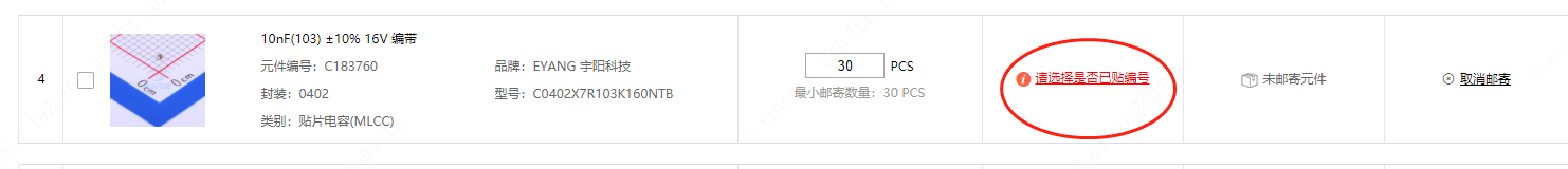 第一步:在下SMT订单选器件界面,未匹配到型号的器件,可以直接邮寄,可以点【申请邮寄编号(收费)】