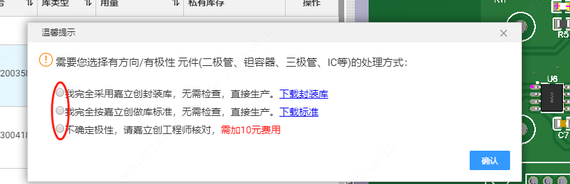 第五步:在弹出的【温馨提示】窗口,勾选您需要的有方向、有极性 元件(二极管、钽容器、三极管、IC等)的处理方式