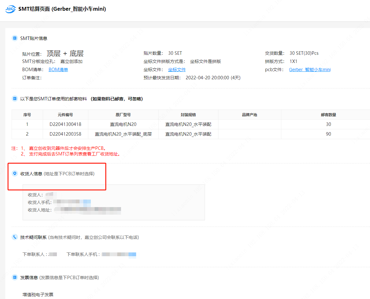 第七步:核对好后,点【确认下单】,点完后系统会自动跳回主页,这样需要邮寄的器件才算真正加入到【待邮寄】清单里,未下单的话,需要邮寄的器件不会显示出来。(若您属于标准型号的订单,将不再等邮寄器件入库。PCB资料与SMT工程资料做好后,即可安排生产。)