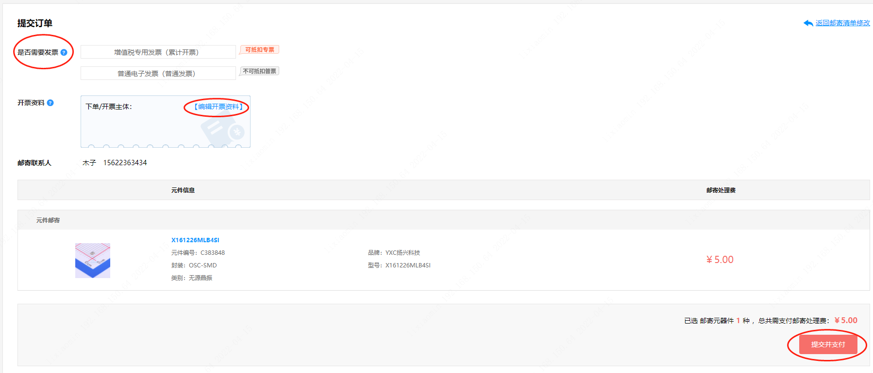 第十一步:之后点击【去支付入库服务费】,会弹出提交订单页面,选择【是否需要发票】,并编辑好【开票资料】。完成后点击【提交并支付】。