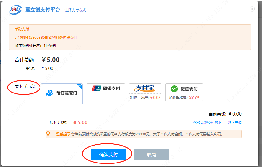 第十二步,选择支付方式付款后,点击【确认支付】就完成了邮寄器件订单。
