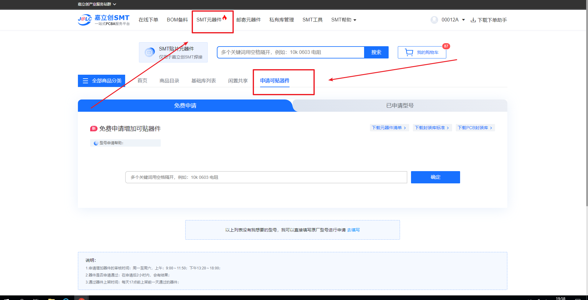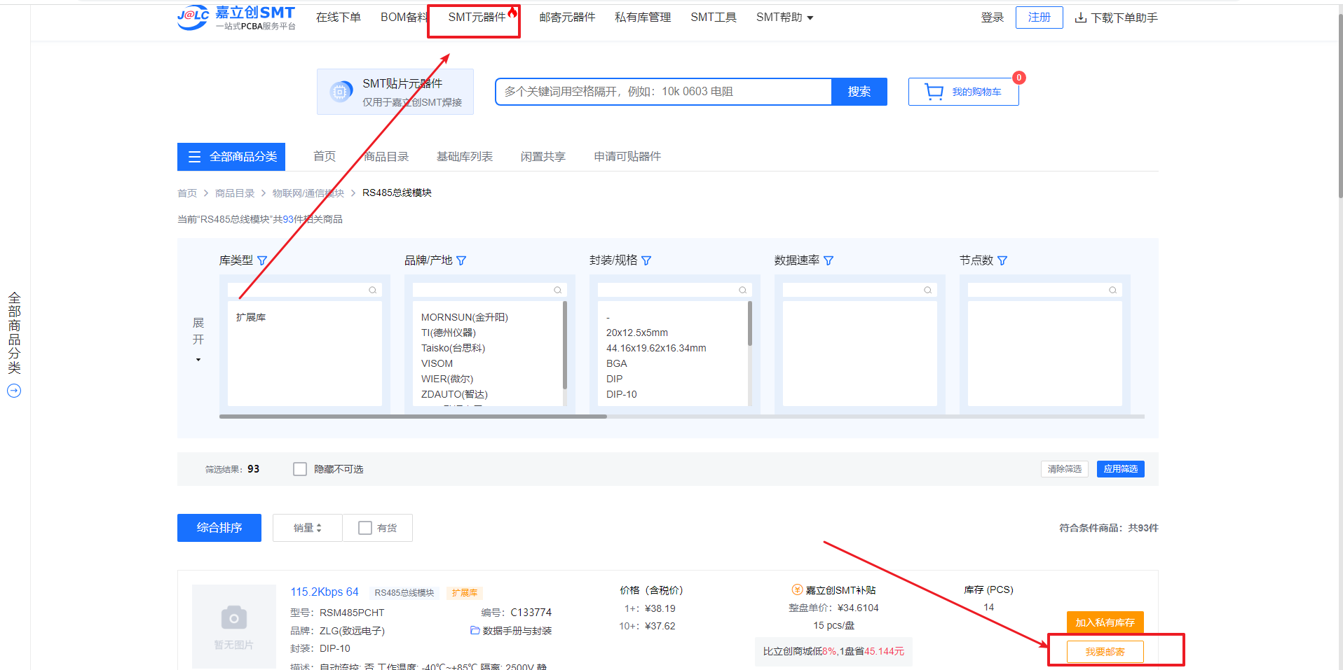 答:在SMT元器件的器件都可以寄料,无论嘉立创是否有库存(目前基础库是不支持邮寄的)步骤如下图:
