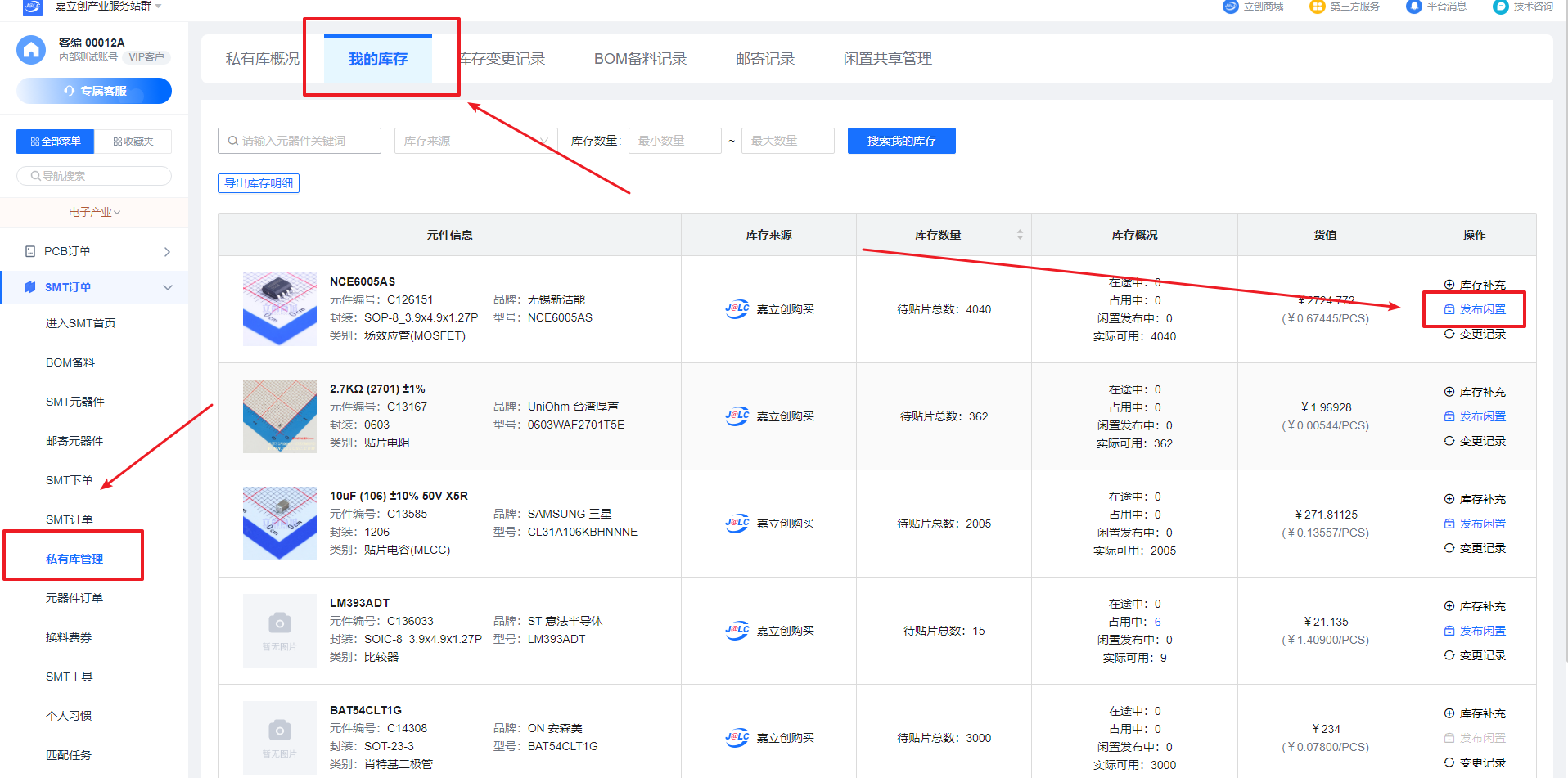 第一步:在【私有库管理】--【我的库存】内“库存来源”处选“嘉立创购买”后可以查看库存总数。如有多出可点击“编辑闲置”按钮。
