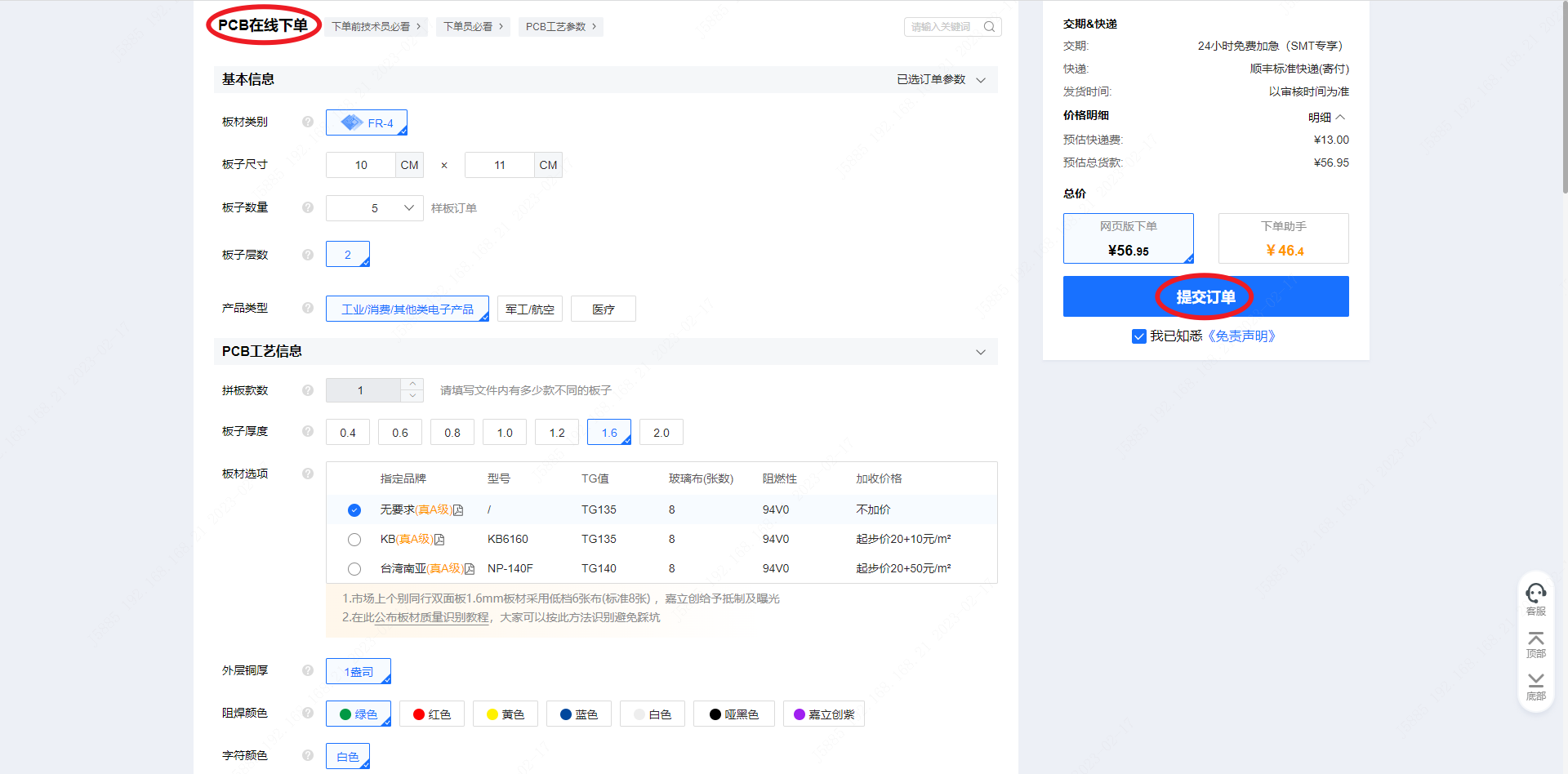 第二步: 点击后会出现“PCB在线下单”页面,客户填写PCB需求后(只能有限修改加工信息,如数量、油墨、开票方式),点击“提交订单”即可。
