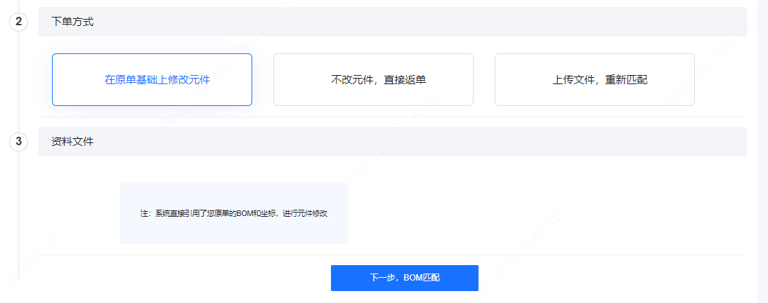 第四步:而后点击【选择此单下SMT】按钮后会出现上下标题为“下单方式”、“资料文件”的页面框。您可以在框上方的【下单方式】,选择您需要的下单方式(三种:“在原单基础上修改元件”/“不改元件,直接返单”/“上传文件,重新匹配”)后点击下一步。