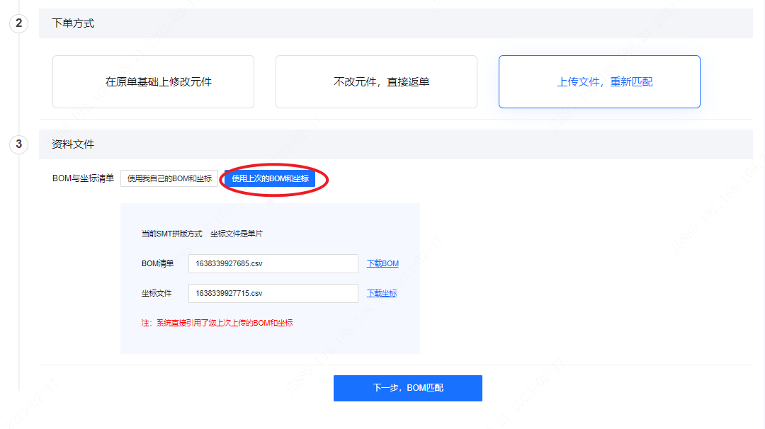 2.也可以选择“使用上次的BOM和坐标”,系统会默认上传之前得BOM清单和坐标文件,再点击“下一步,BOM匹配”。
