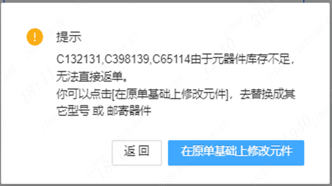 点击“库存不足的不贴,继续返单”继续下单,也会直接跳转到“提交订单”页面,但用此方式操作下单SMT为新单)