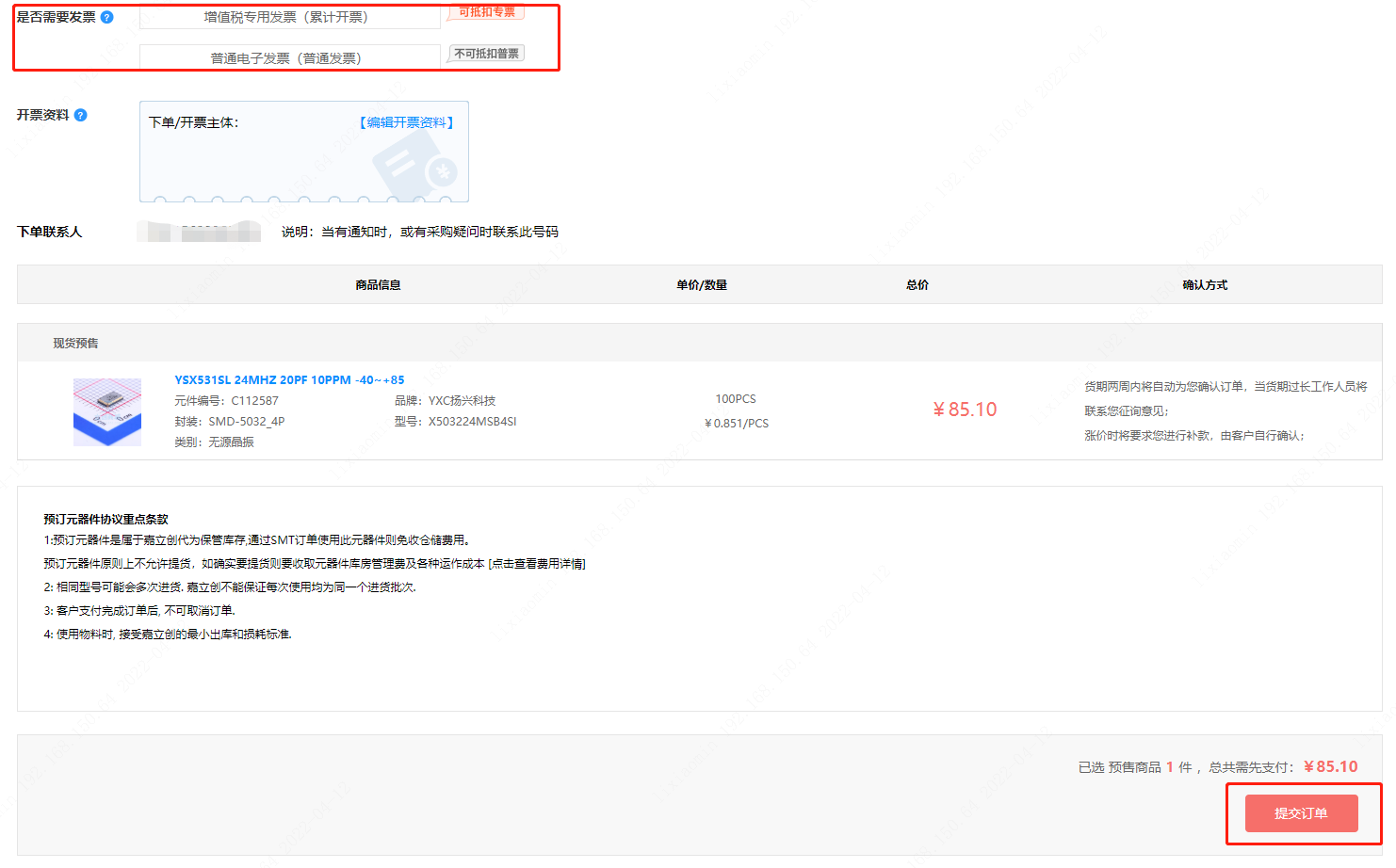 第四步:点击【结算】后,会弹出提交订单弹窗内,要注意在【是否需要发票】选择您所需要的“开票方式”,并编辑完善好【开票资料】和【下单联系人】,而后点击【提交订单】。