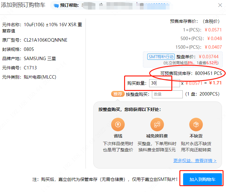 (2)在弹窗内输入需要的数量,数量 大于 “可预售现货库存”“为预订(期货,嘉立创需要询价、购买、器件入库后,客户下单匹配才可以使用)。