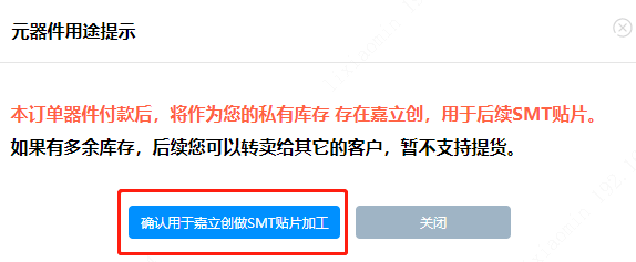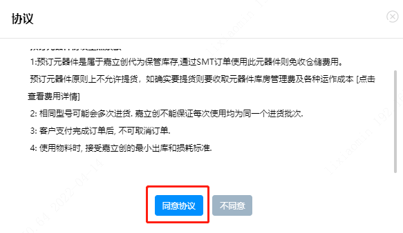 第五步:点击【提交订单】按钮后,会弹出【元器件用途提示】窗口,选择【确认用于嘉立创做SMT贴片加工】按钮。而后会弹出协议窗口,阅读并点击【同意协议】。