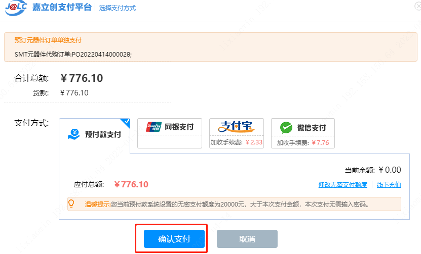 第六步:而后弹出嘉立创支付页面,选择支付方式,点击【确认支付】,付款后,点击【已完成支付】,那么私有器件订单即下单成功。