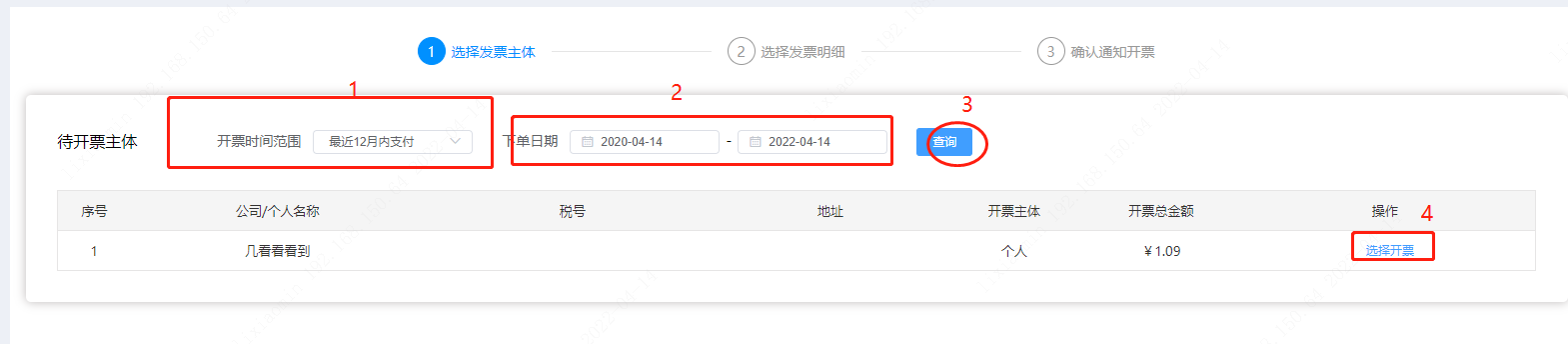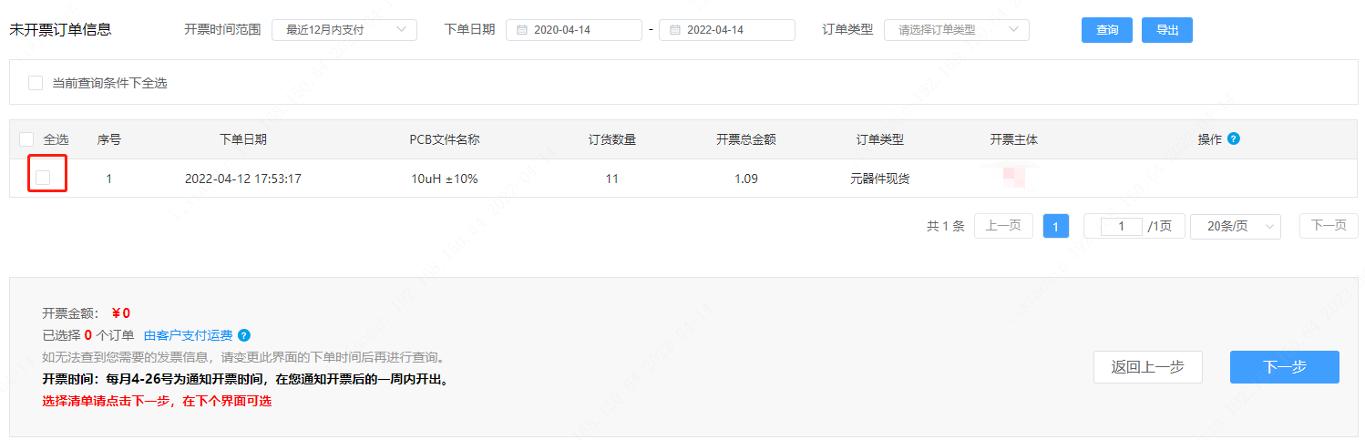 第二步:点完后,会弹出待开票主体页面,选择开票时间范围和下单日期,再点击【查询】核对开票总金额等,再点击【选择开票】。