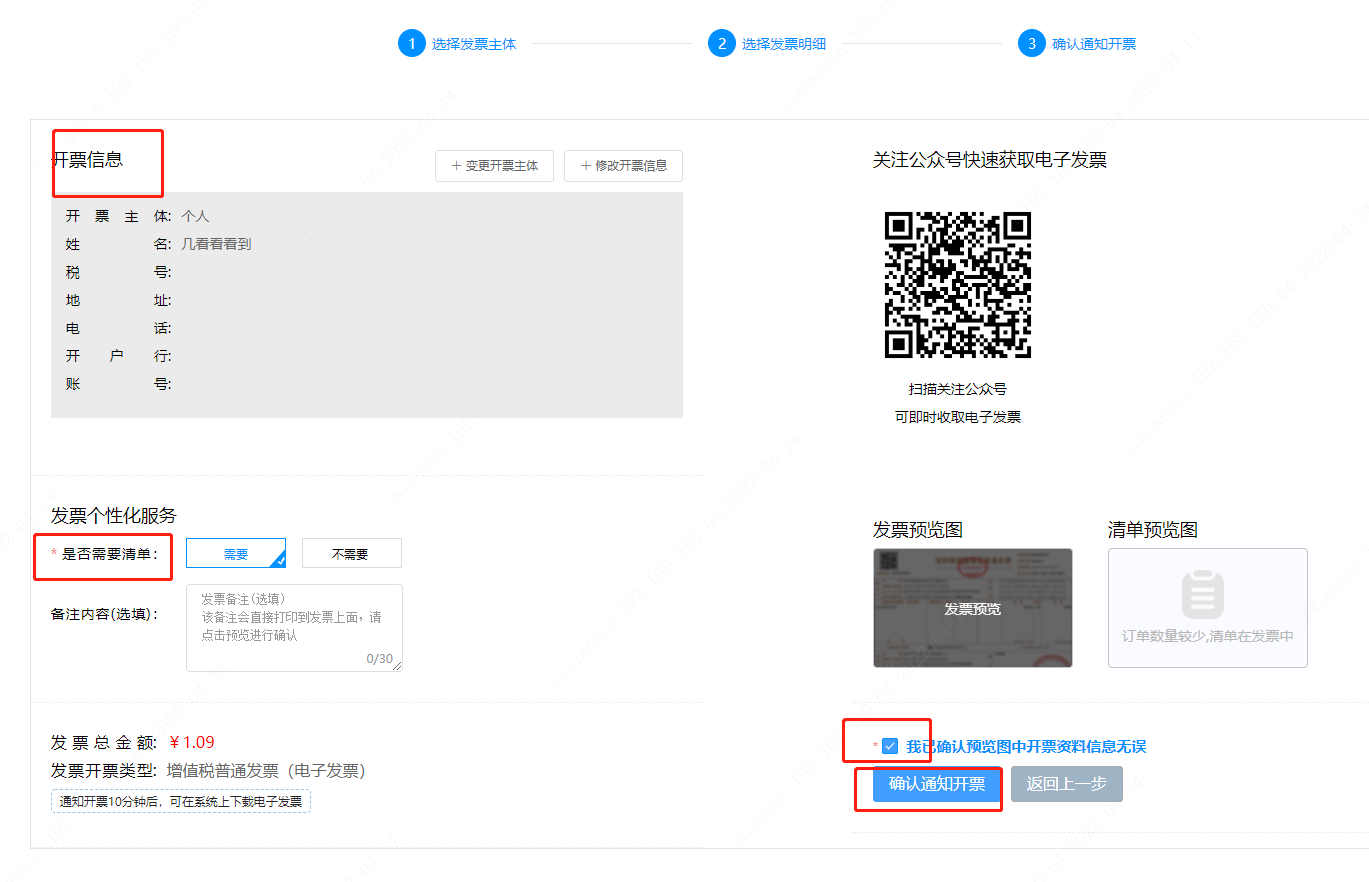 ③而后勾选【我已确认预览图中开票资料信息无误】,点击【确认通知开票】即成功了。
