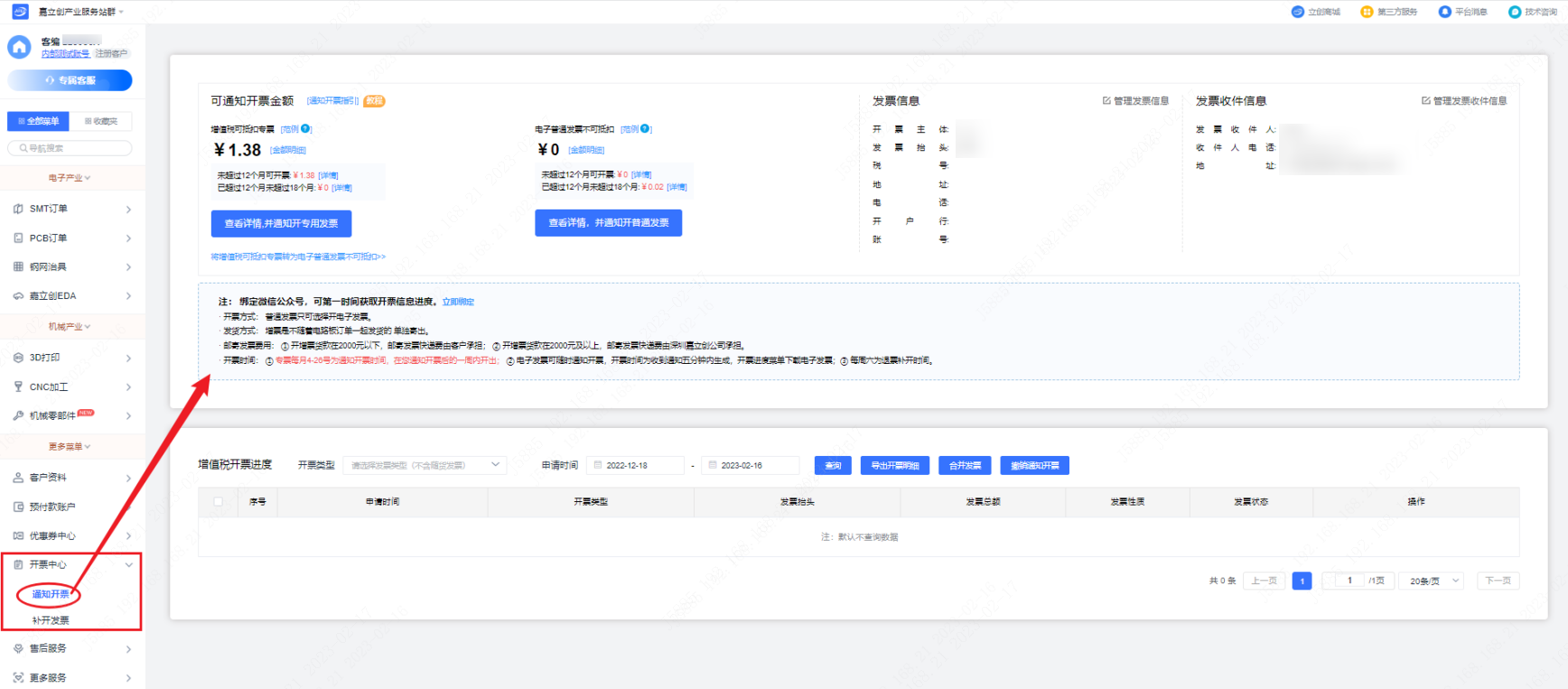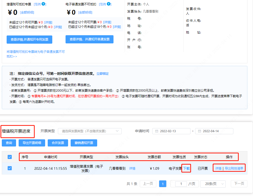 第五步:若想查看所开增值税发票进度或者下载电子发票,点击【通知开票】,在框的下方可以看到增值税开票进度,您也可以下载电子发票。