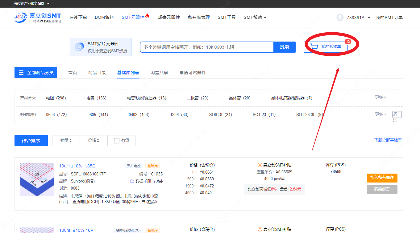 ①点击SMT元器件,进入下一个界面---购物车