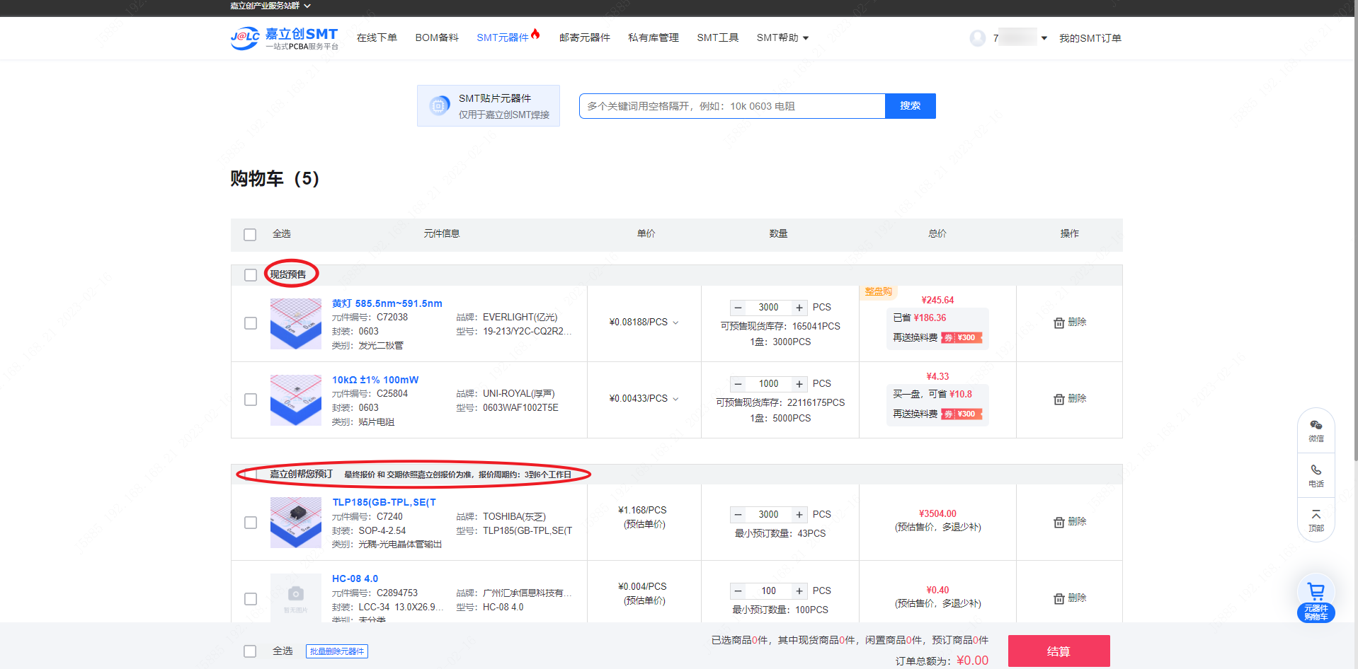 在嘉立创只有整盘预订、整盘购买的器件才有优惠,换料费(上料费)统一5元每个型号。