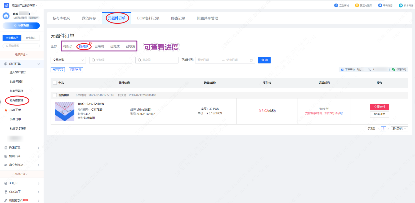 第一步:若想查看预订器件订单进度、费用,可以点击【私有库管理】,再点击【元器件订单】即可。