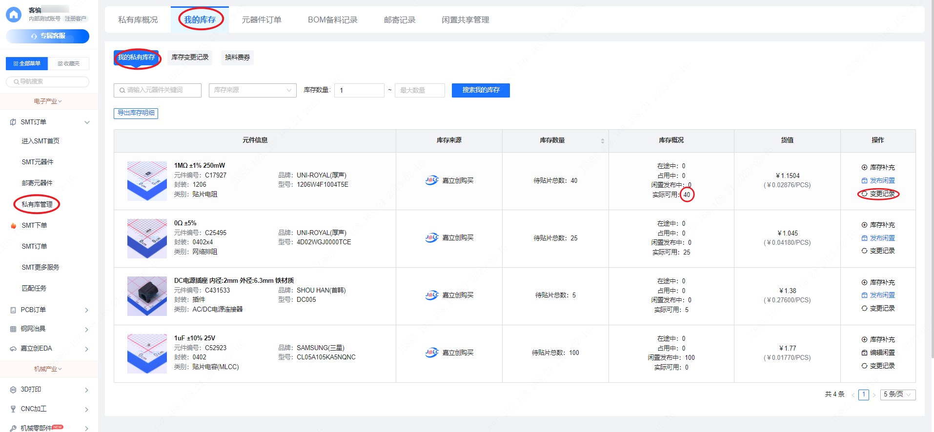 6.所有购买的器件,需要等器件在“我的库存”内可以看到数量,下单匹配上,贴片的时候才可以贴上。