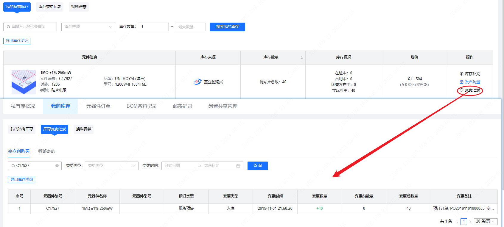 第三步: 若想查看私有物料使用情况,鼠标移到【变更记录】按钮,点击会弹出【私有库存管理】窗口就可以看到信息